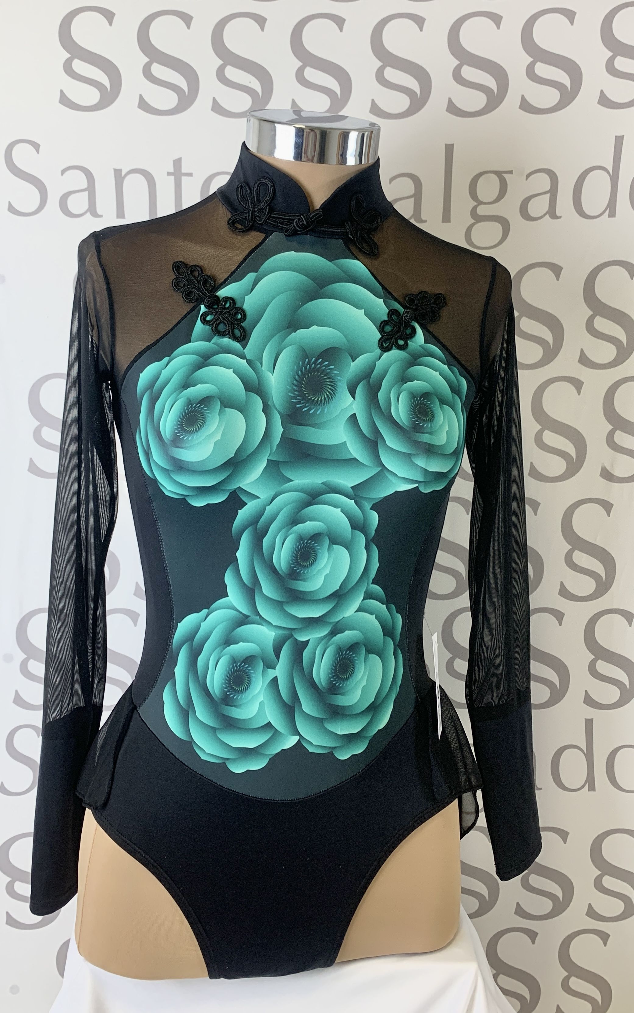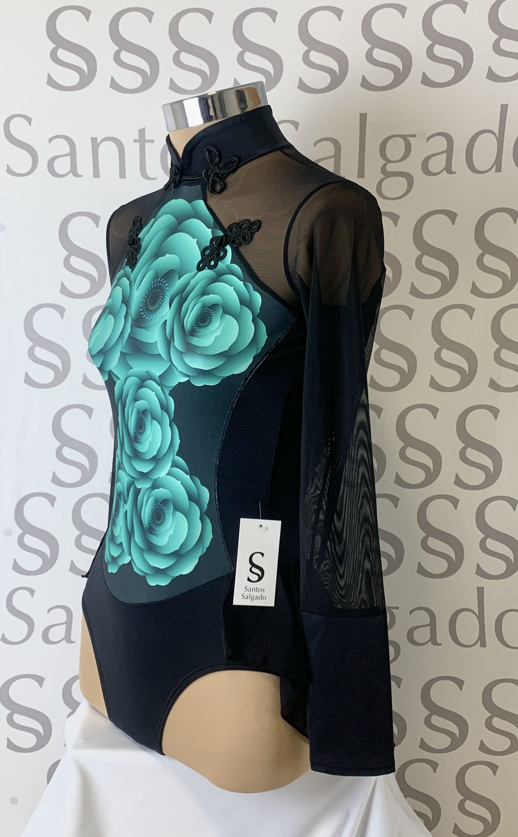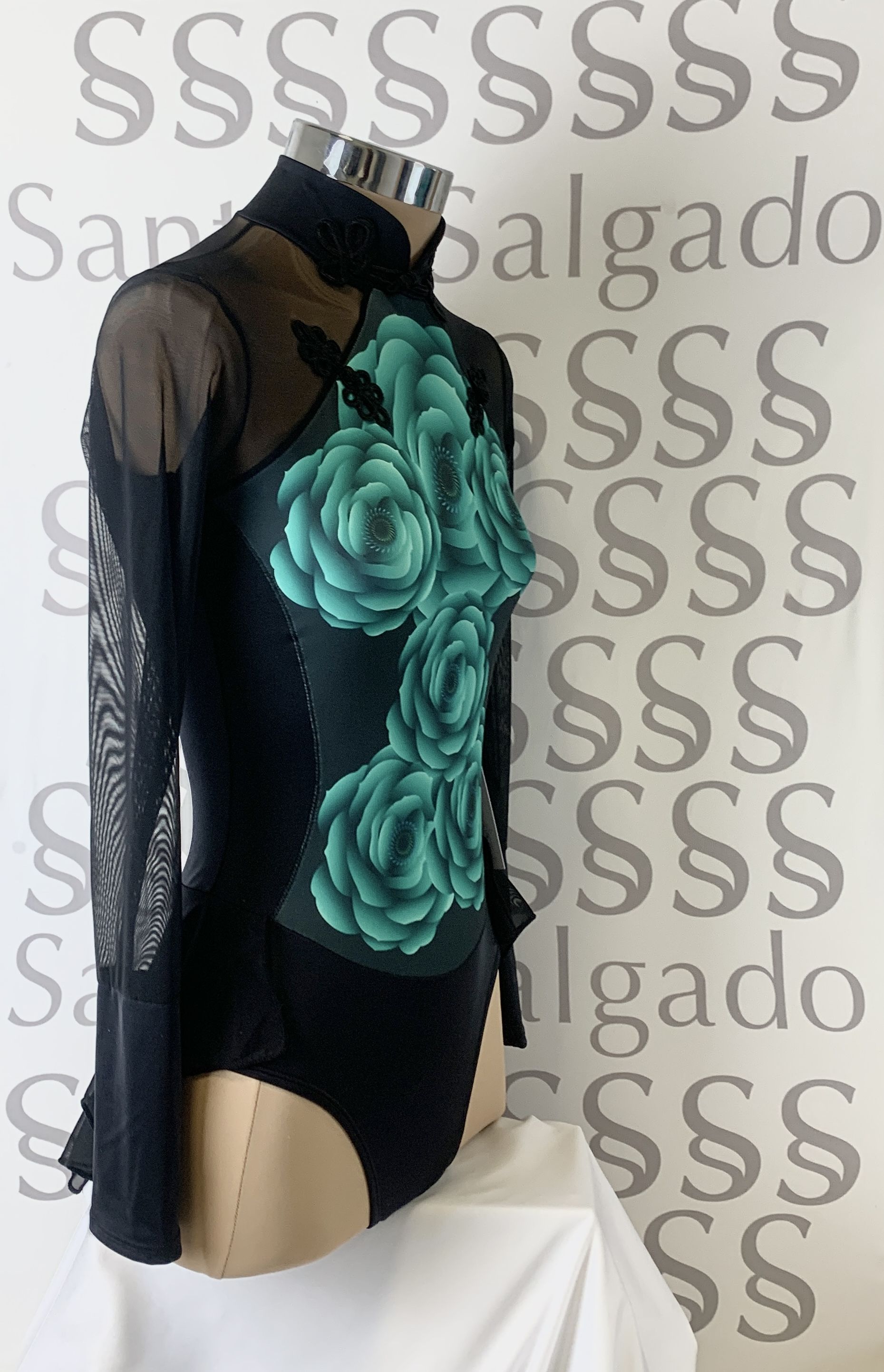 Talla 6 Maillot de cuello alto en tonos negros con falda no completa en gasa negra y manga larga con gran puño. Gran escote en espalda Detalle de pechera con estapado de flores en verde agua 3D y adornos de cierres orientales en cuello
