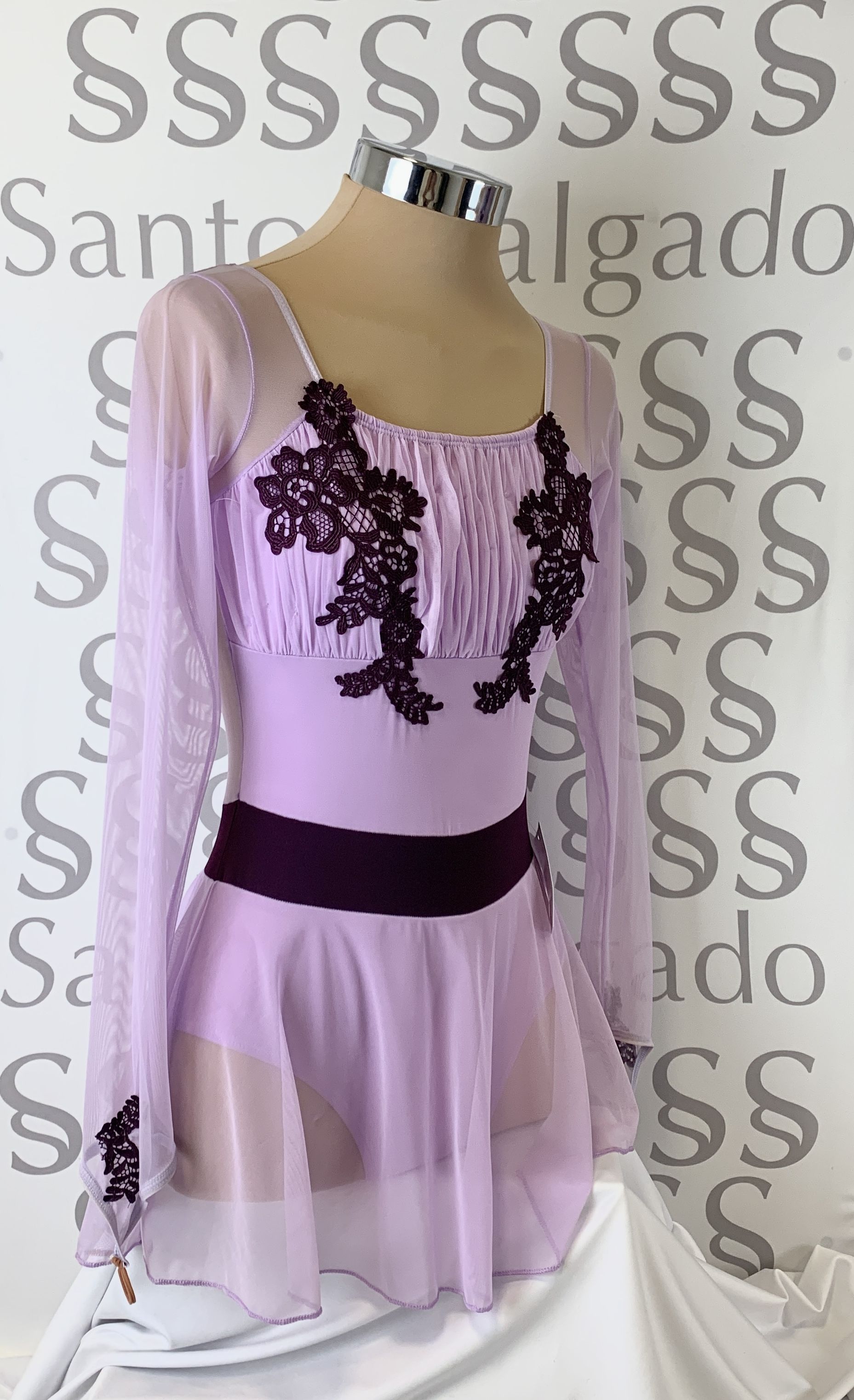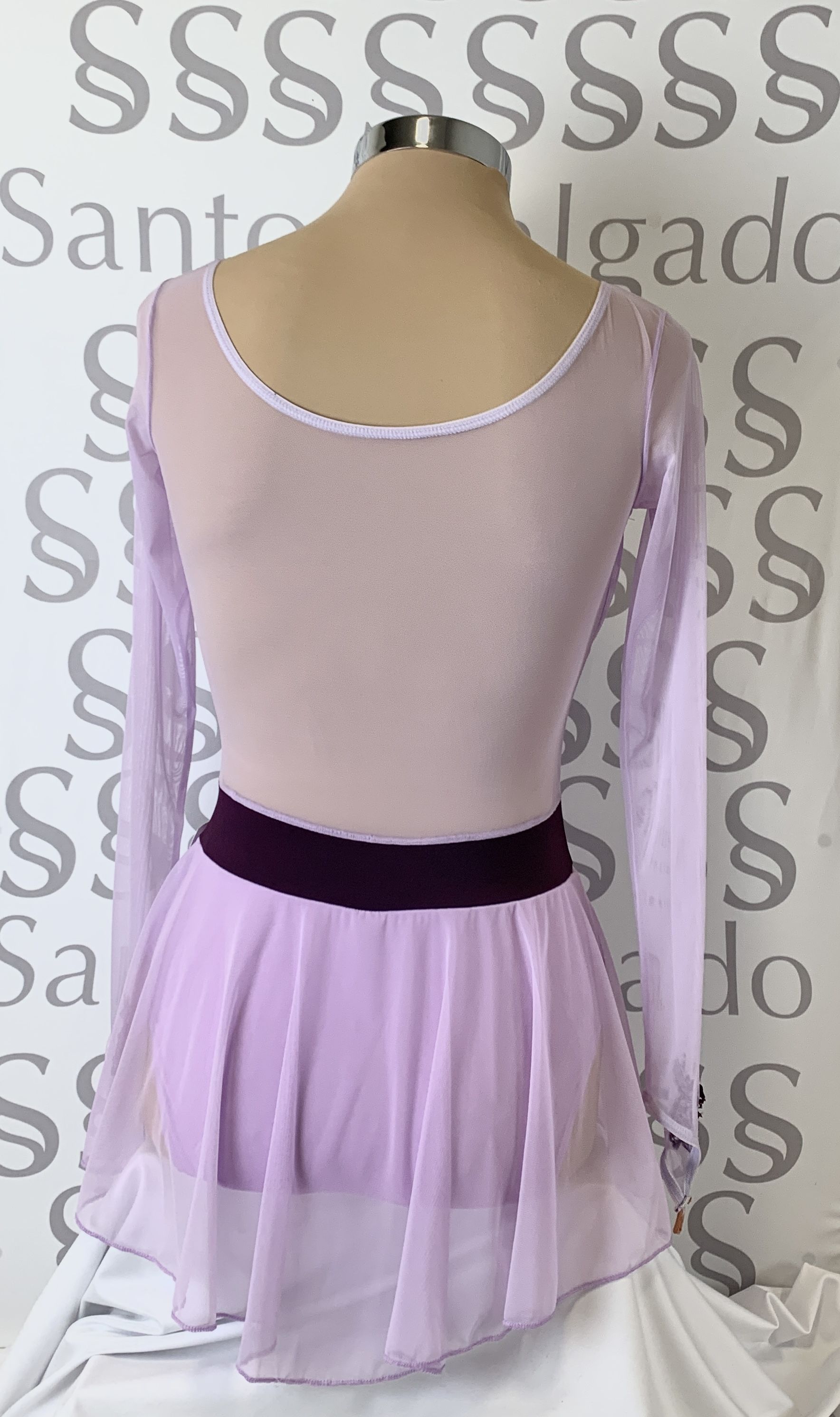 Talla 6 Maillot de escote cuadrado con manga larga de gasa y falda con vuelo de gasa. Detalle de pechera de gasa drapeada y espalda en gasa. Detalle de especie de cinturón a tono con apliques del pecho y muñecas