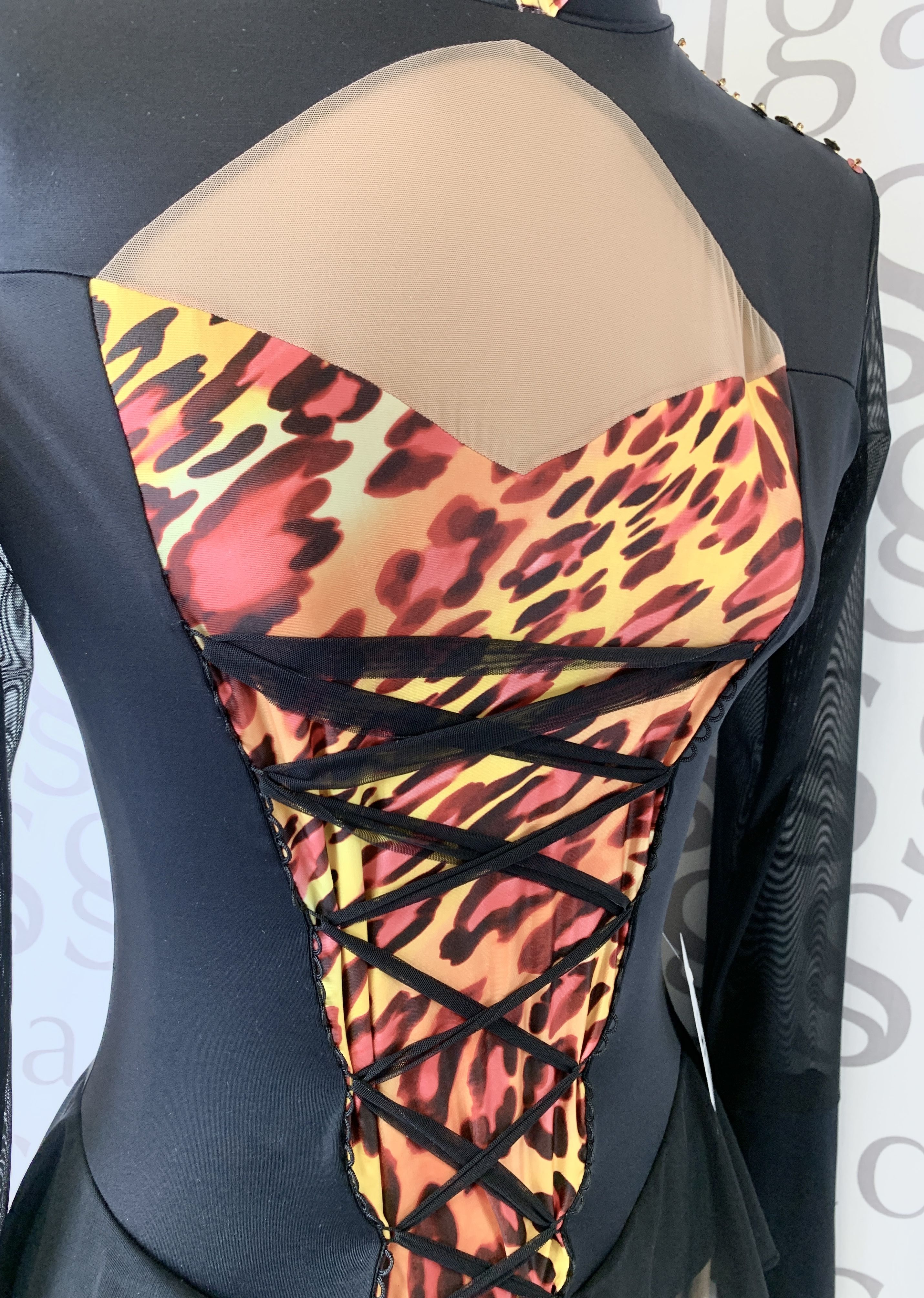 Detalles de animal print en cuello, escote espalda y pechera.