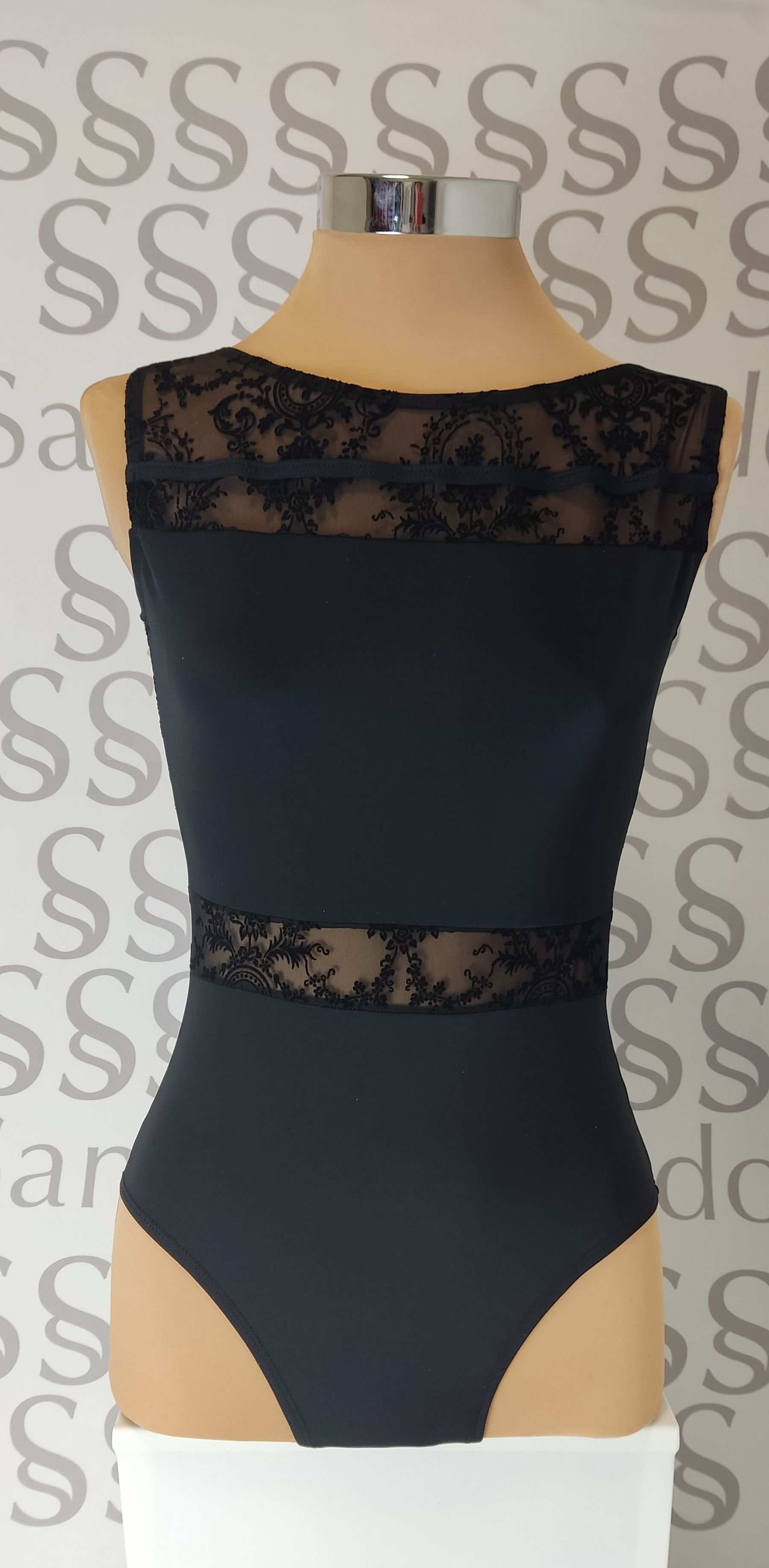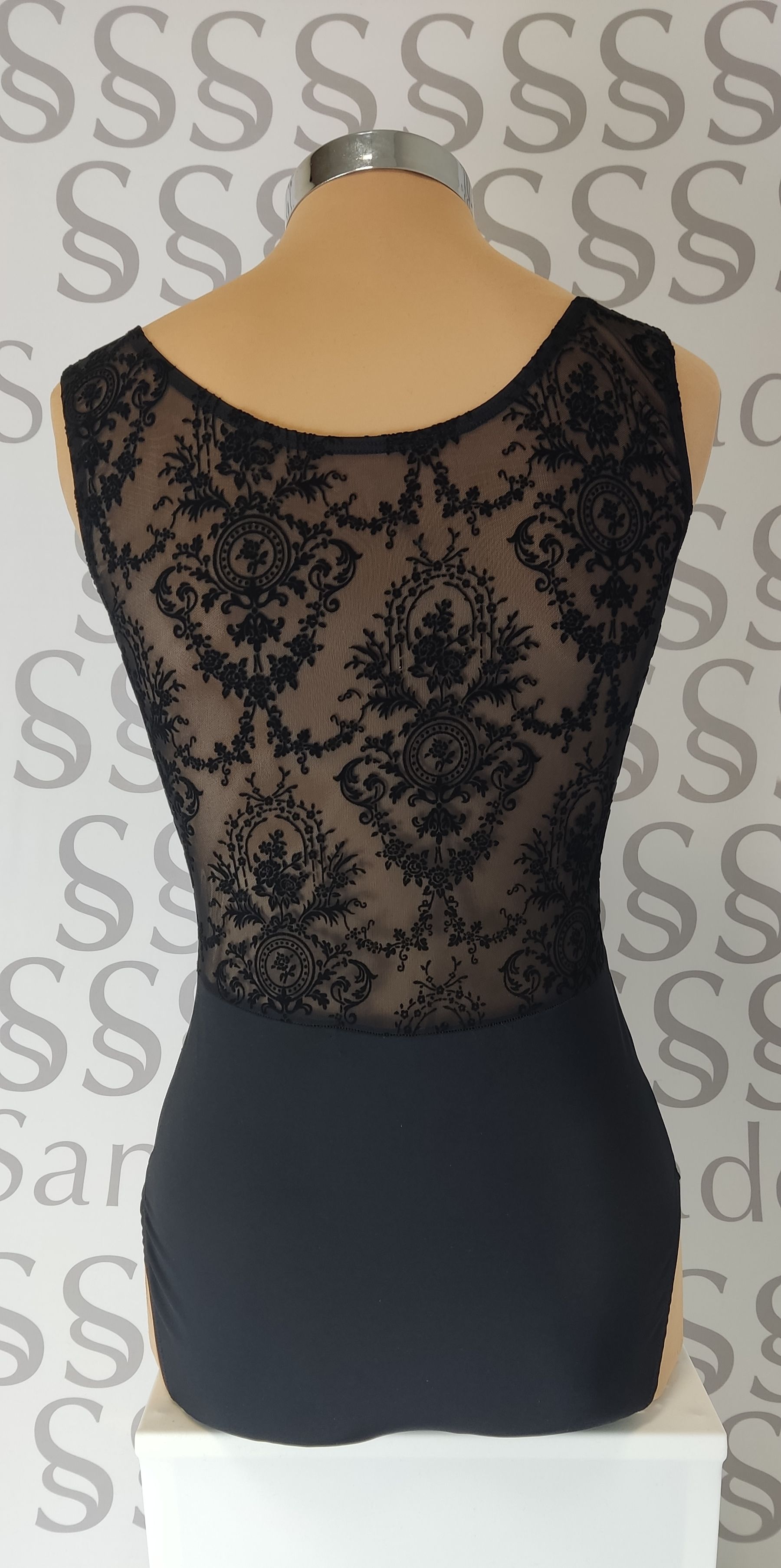 Maillot en lycra negra coordinado con gasa devoré negra con estampados barrocos